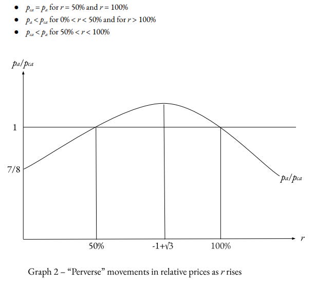 If r is 0, then there all expenses go to wages, however, as r varies, the relationship is non-linear as r grows. Depending on the rate of r, the relative price ratio can change.
