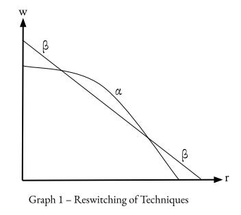 As r changes, one would expect a smooth monotonic relationship with a rising capital-to-labor ratio and a lower profit rate. However, under the Sraffian system, there is a non-monotonic relationship between the choice of technique with r and w.